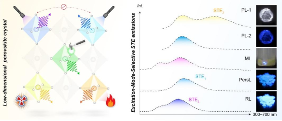 近年來,全無機金屬鹵化物鈣鈦礦作為新一代發光材料,因其獨特的“主-客體”結構、溶液可加工性以及可調諧的光致發光特性,在照明顯示、輻射探測、先進傳感等領域展現出廣闊的應用前景。這類低維金屬鹵化物的發光主要源于自陷激子復合,通常具有寬帶發射、較大的斯托克斯位移以及較小的自吸收等特點。然而,針對無機金屬鹵化物晶體在X射線和機械力刺激下多激子發射調控的研究相對滯后。因此,亟待拓展無機金屬鹵化物鈣鈦礦在多重激勵/刺激通道下的光學特性,以滿足其在實際應用中的多樣化需求。為此,本文采用具有全無機鹵化物雙鈣鈦礦單晶作為研究對象,通過單一銻離子摻雜實現了可由紫外光、X射線以及機械力選擇性激發的多重激子發射。得益于較小的能量串擾和散射效應,在雙鈣鈦礦透明晶體中實現了源于多自陷激子態的量子產率接近100%的光致發光、小時級別長余輝發射以及可重復的高效力致發光。此外,本文不僅在實驗上明確了稀土基雙鈣鈦礦基質中的藍色發射主要來源于原料中存在的銻離子雜質,也在單一組分無機鹵化物中實現了從紫外C至近紅外范圍的力致發光調控,涵蓋了4f-4f、5d-4f、3d-3d及激子復合等多種發光機制。該工作不僅為低維金屬鹵化物鈣鈦礦的研究提供了創新范例,也拓展了其在新型多級數據加密與一體化認證技術的應用前景。