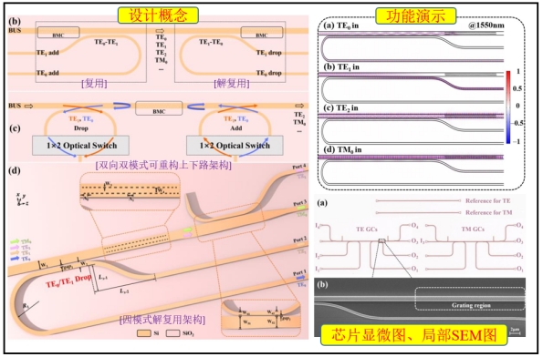 隨著以人工智能為代表的新一代變革性信息技術的涌現,以電子作為信息載體的微電子芯片正面臨日益突出的“電子瓶頸”問題,與現有標準CMOS集成電路工藝兼容的硅光芯片技術是目前最具潛力的解決方案。近期,物理學院光信息技術團隊吳勝保副教授聯合東南大學、南京理工大學、福州大學等單位研究人員,在構建大容量、高集成度硅光芯片中的關鍵功能單元,如模分復用、偏振管理、交叉連接等取得了系列進展。